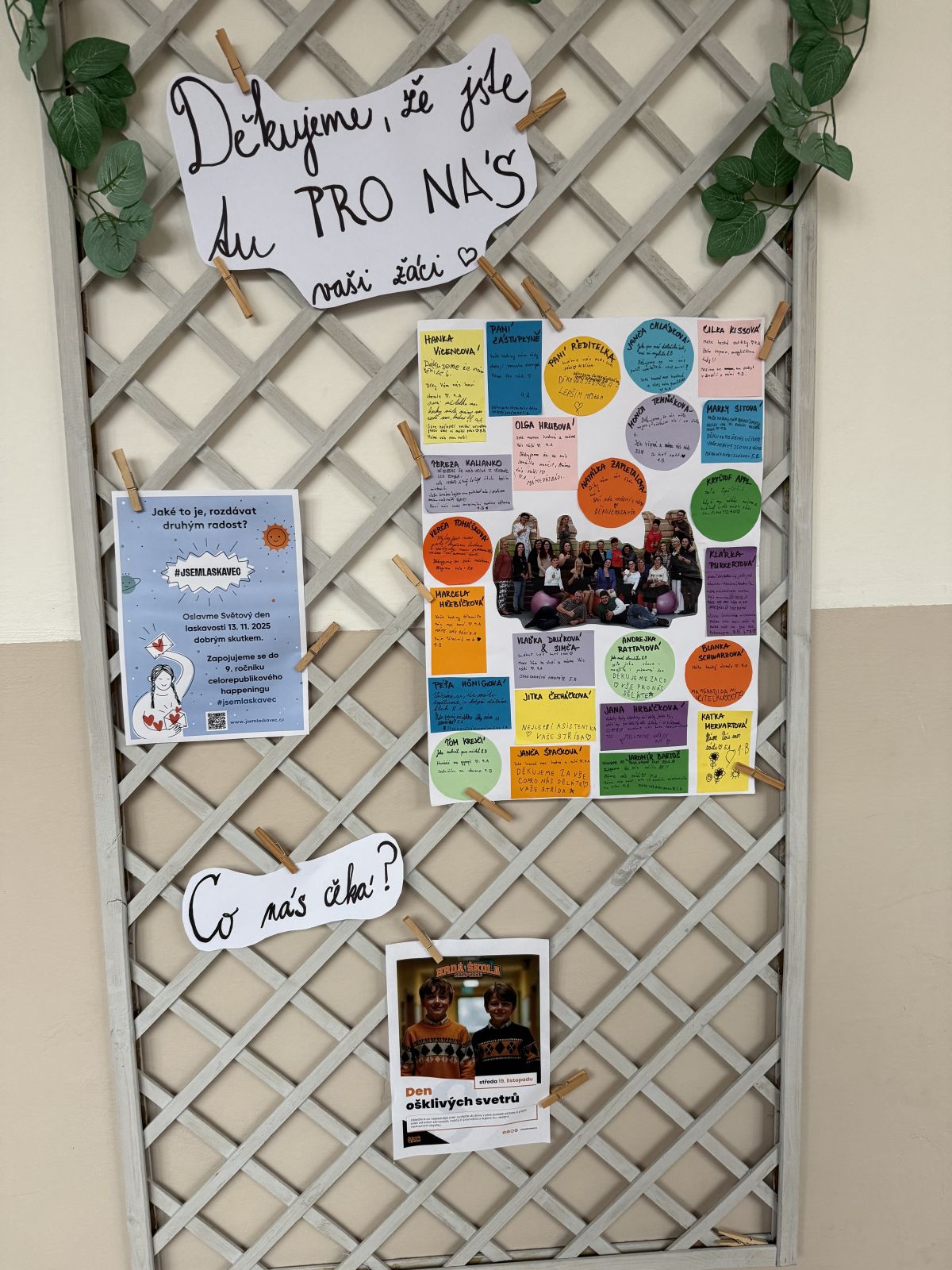 Ale laskavostí jsme nešetřili ani ve škole! Po celé budově jsme vylepili afirmace pro všechny - a hlavně jsme připravili speciální nástěnku pro učitele, kam každá třída přidala svůj obrázek nebo osobní vzkaz.