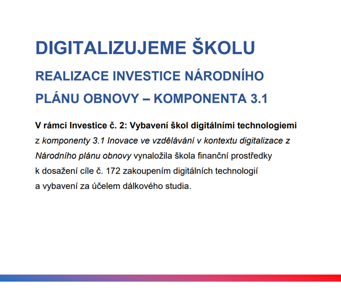 DIGITALIZUJEME ŠKOLU REALIZACE INVESTICE NÁRODNÍHO PLÁNU OBNOVY – KOMPONENTA 3.1 Soubory Vzor publicity cíl 172 – distanční výuka